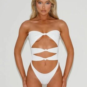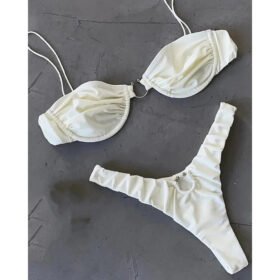 Swimsuit two Piece Set Women’s Sexy Halter Neck Fishnet Adjustable Bikini Bottoms Cream White